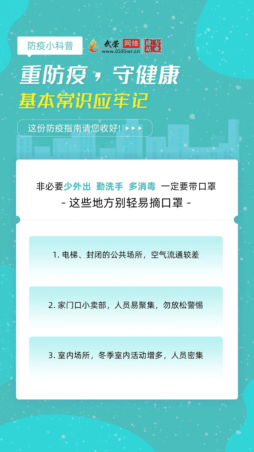 养成开窗通风、清洁消毒、佩戴口罩、勤于洗手、保持社交距离、少聚集不扎堆、使用公勺公筷等健康生活方式,咳嗽打喷嚏时注意遮挡,在公共交通工具、电梯等密闭场所要全程佩戴口罩。注意饮食安全,生熟食品分开加工,食物要烧熟煮透,不食用野生动物。