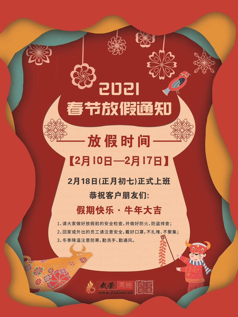根据《国务院办公厅关于2021年部分节假日安排的通知》,武荣网络2021年春节放假时间为:2021年2月10日(腊月廿九)至2月17日(正月初六),共8天。