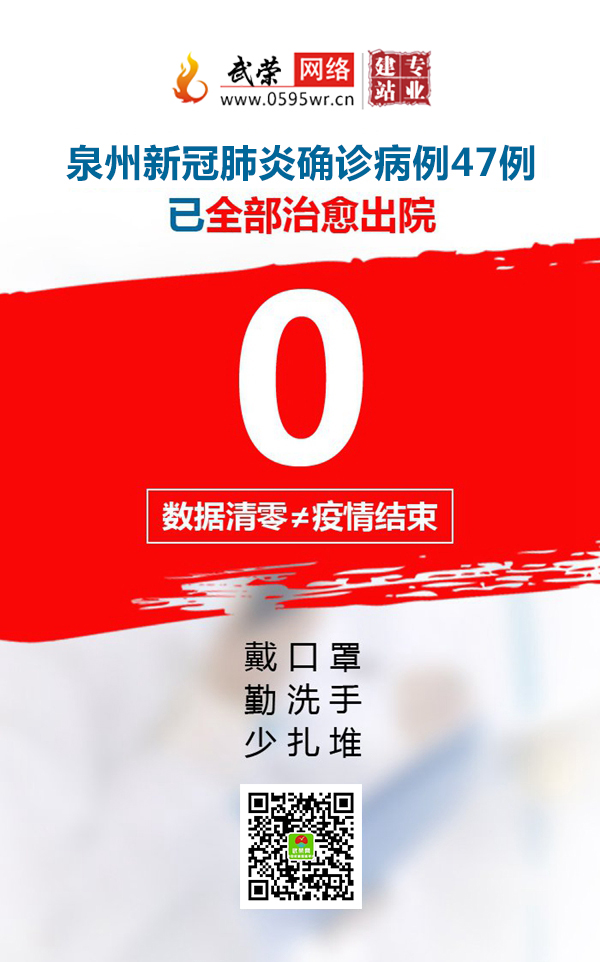 从泉州市卫健委获悉,随着今日下午,泉州市定点医院最后一例新冠肺炎确诊病例治愈出院,泉州新冠肺炎确诊病例清零啦! 自1月23日泉州市报告首例确诊病例以来,累计报告47例(包括1例危重型、3例重型)确诊新冠肺炎病例已全部治愈,实现确诊患者零死亡、医务人员零感染。