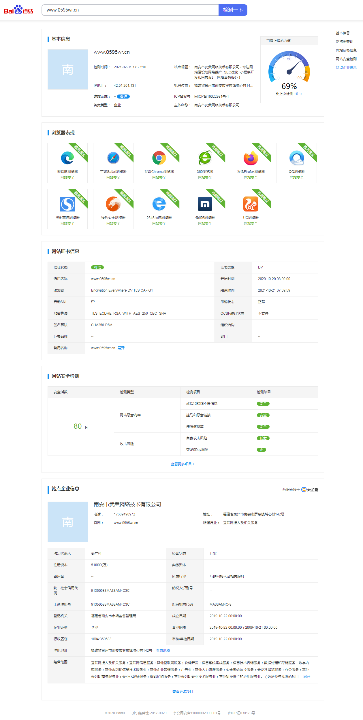 主要审查了当下主流浏览器产品的访问情况,是否由于网站一些常见因素而出现异常,比如:证书配置的问题,如果没有进行证书配置,也会给出相关性的提示。
