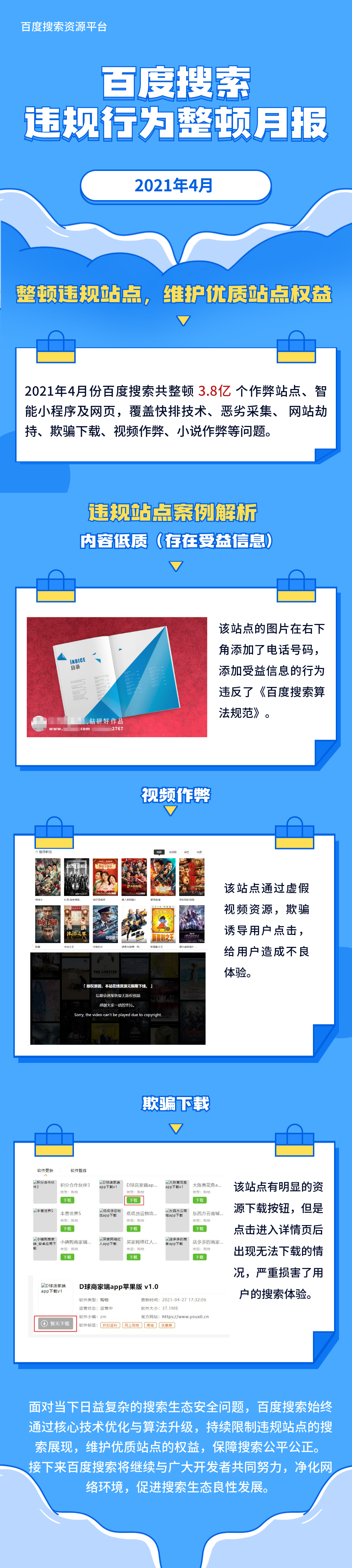 5月13日,百度搜索发布了4月违规行为整顿月报,数据显示,4月,百度搜索持续通过全方面手段打击清理3.8亿个作弊站点、智能小程序及网页。...