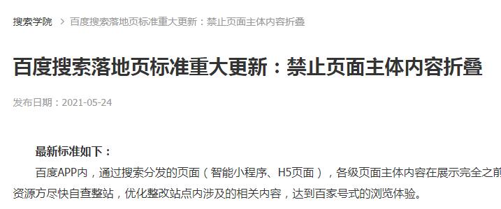 昨天,百度又发布了一个,落地页标准重大更新,明确禁止主题内容折叠。看来他真的是有些飘了。觉得自己可以掌控互联网的资源,任意设置规则。但牢骚归牢骚,大家还是要针对性的看看自己网站是否有问题,改正或者对着干,权衡一下利弊吧!